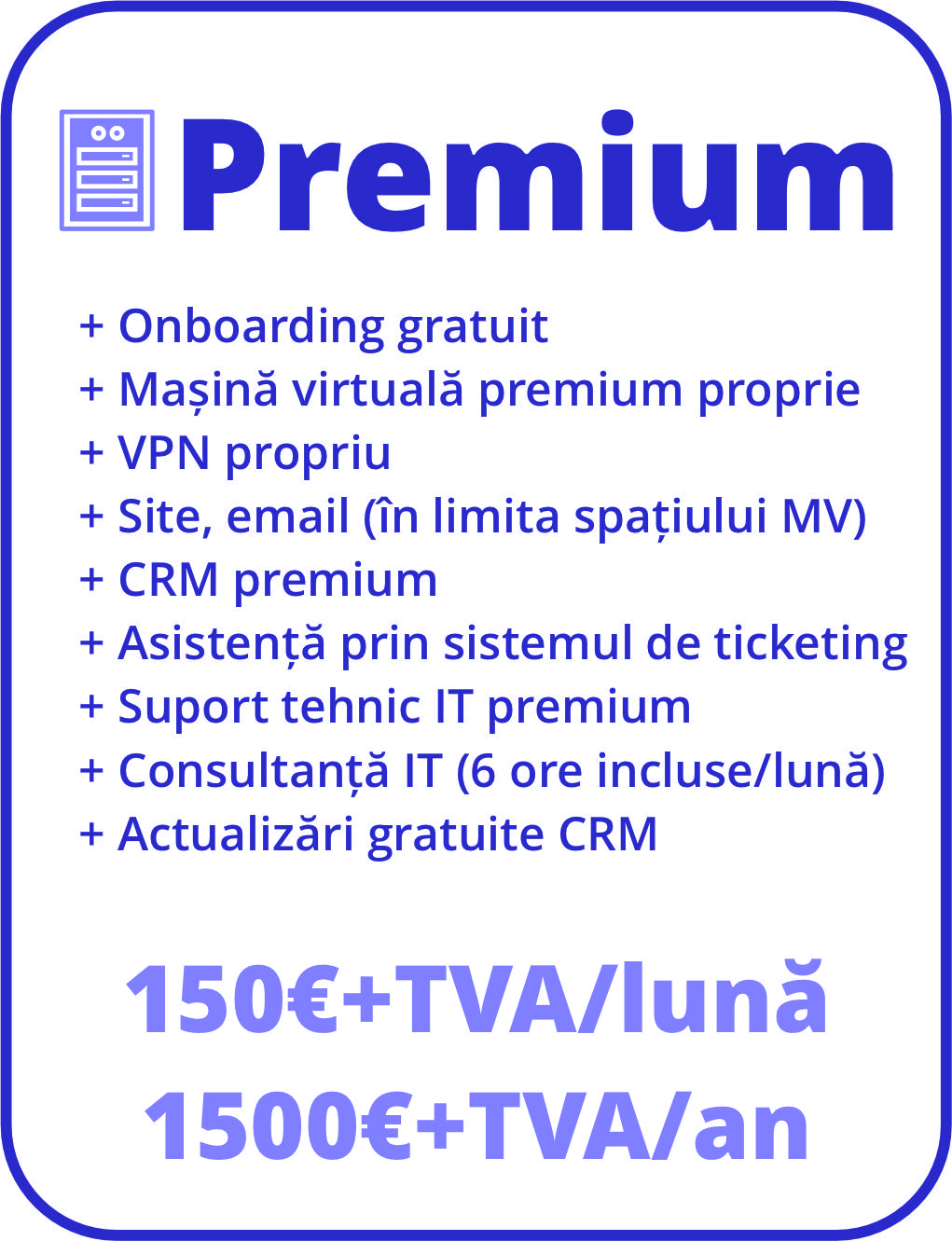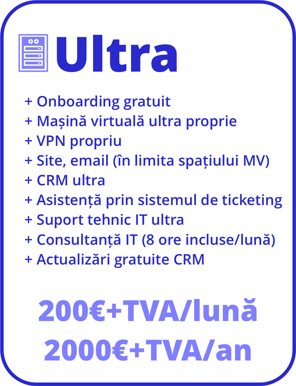 CRM-ul nostru simplu de utilizat vă ajută să gestionați relațiile cu clienții, facturarea și proiectele, în timp ce soluțiile noastre de securitate cibernetică asigură protecția datelor dumneavoastră împotriva amenințărilor online. Alegeți Cyber Plus pentru a beneficia de expertiza noastră în domeniul IT și pentru a vă duce afacerea la următorul nivel.